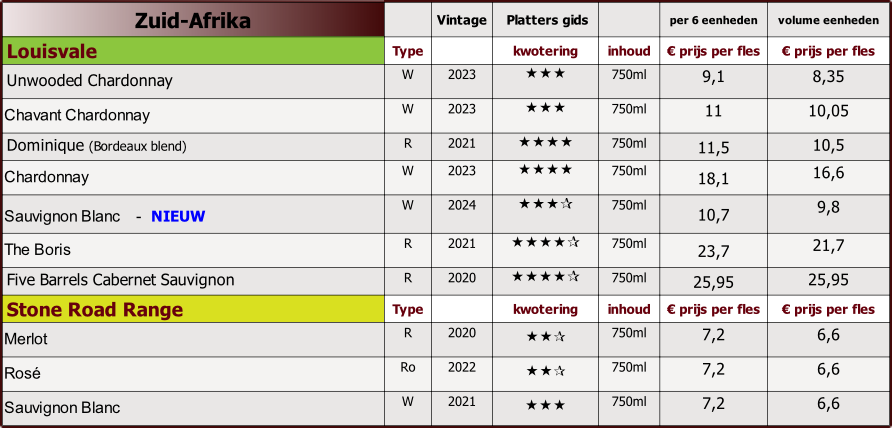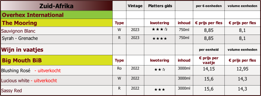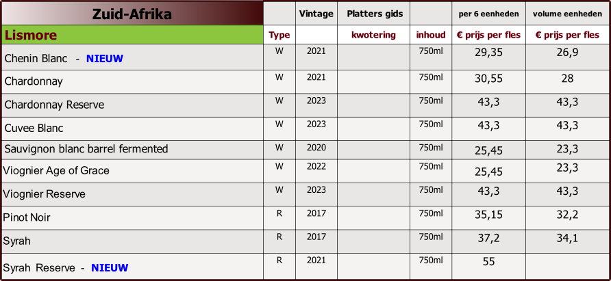 Condities voor specifieke verpakking : (°) prijs per fles - (#) prijs per fles met minimum 12 eenheden -