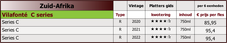 Series C ontleent zijn naam aan de Cabernet Sauvignon en Cabernet Franc, die voornamelijk de stijl van deze wijn omschrijven. De Vilafonté Serie C stroomt met een bijna zwarte kleur met paarse reflecties in het glas van de fijnproevers. Aroma's van bramen en zwarte bessen vullen de lucht. Deze gaan verder op het gehemelte en worden begeleid door de aroma's van zoethout, donkere chocolade en expresso. Door de opslag in eiken vaten, kreeg deze rode cuvee zijn edele eikaroma's. De afdronk van deze nobele Vilafonté Serie C beschikt over een stevige tannine structuur en een zijdezachte toets.